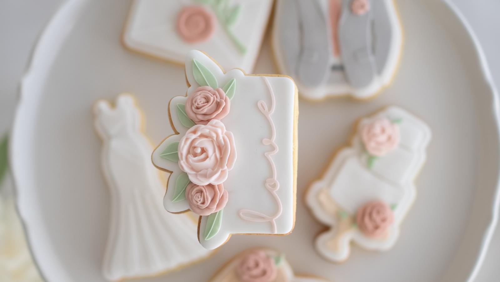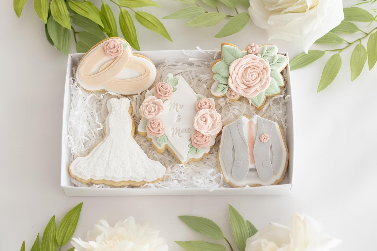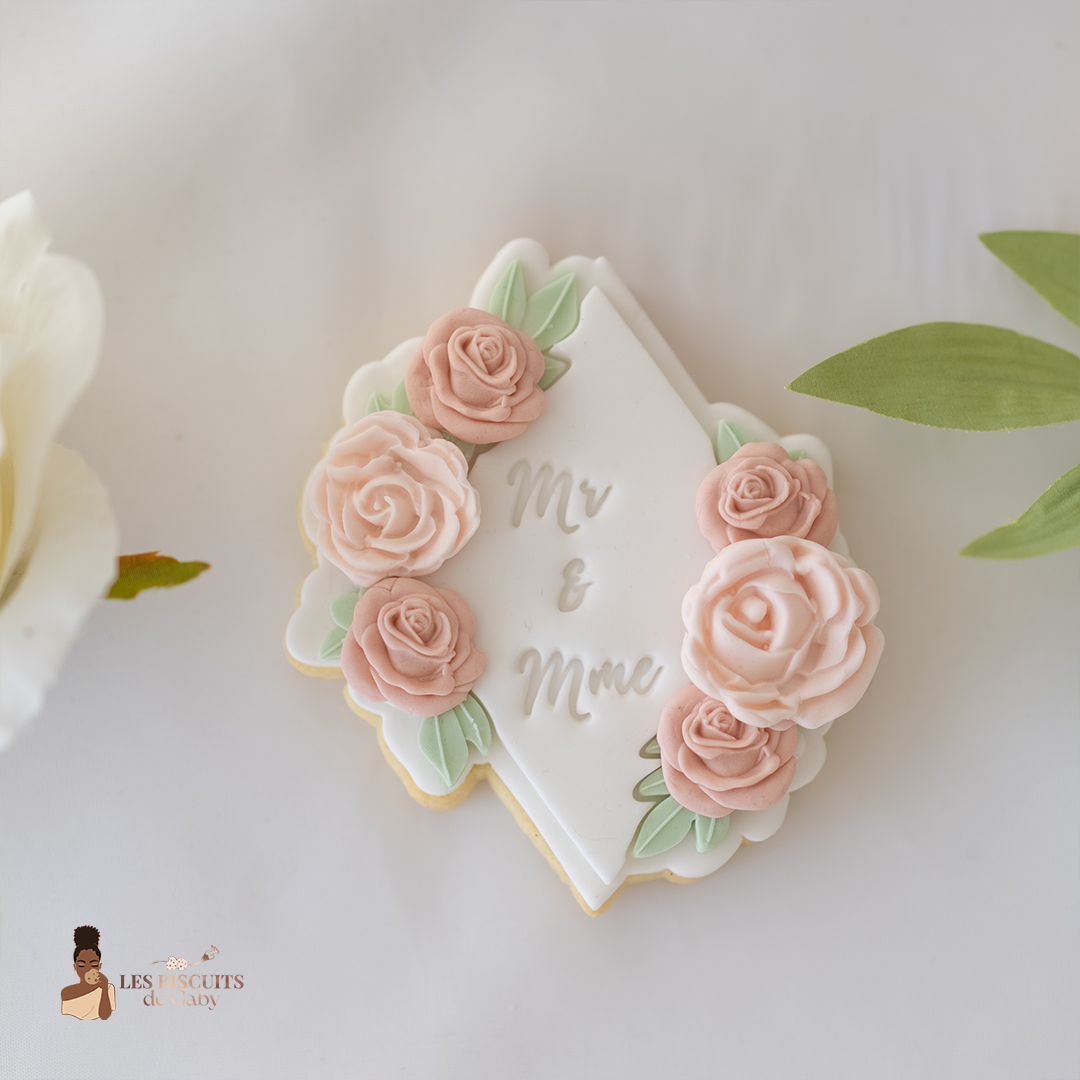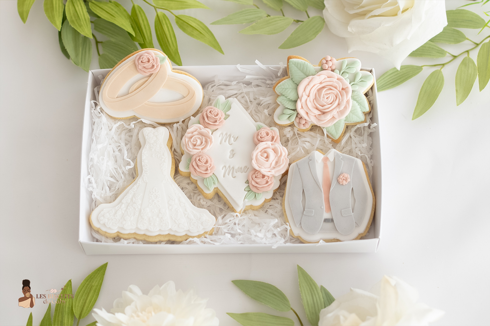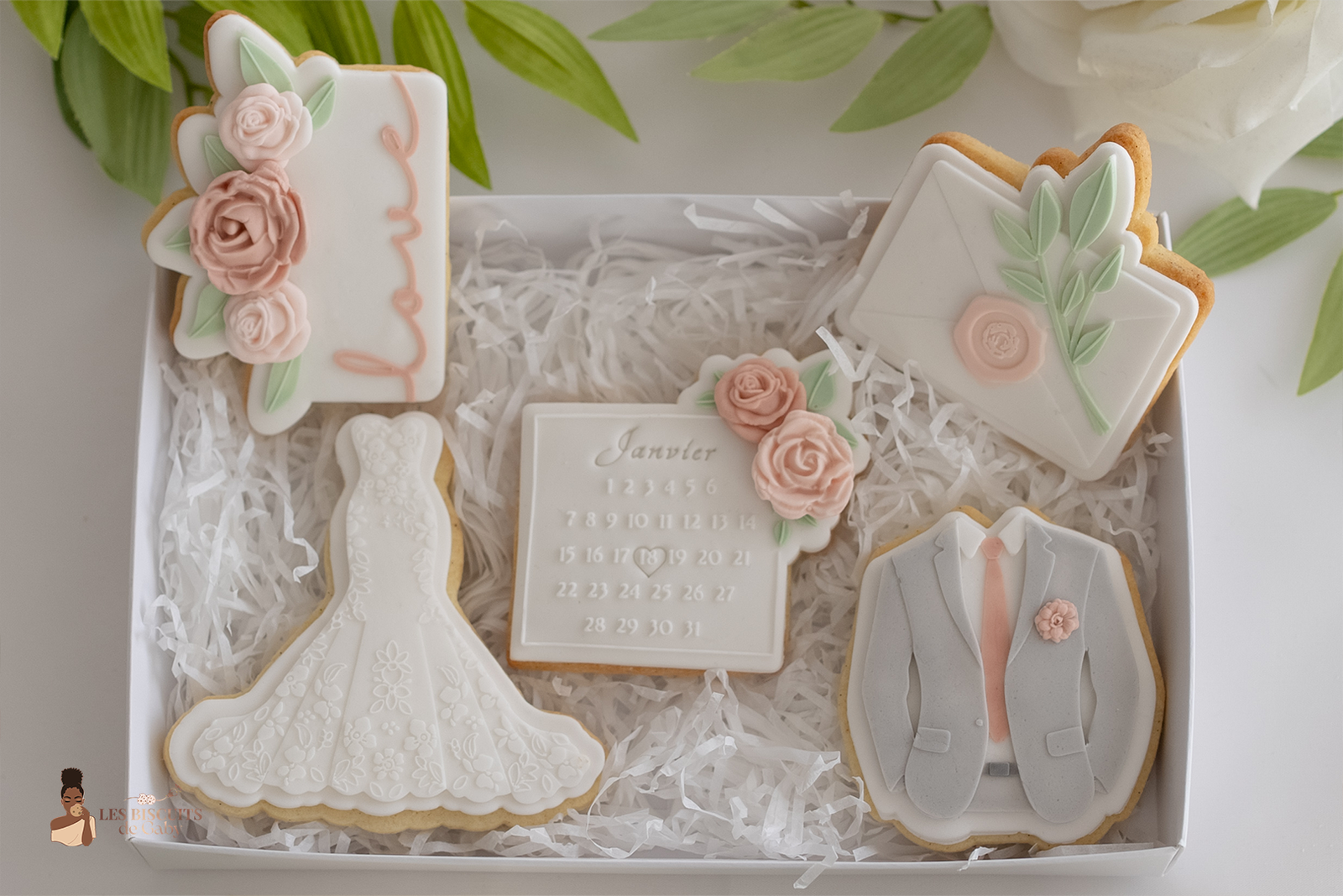 L’attention parfaite pour célébrer leur union. Offrez une touche de poésie aux mariés avec ce coffret de 5 biscuits haute couture. Une harmonie délicate entre rose poudré, vert sauge et blanc pur, conçue comme un hommage gourmand à leur bonheur.