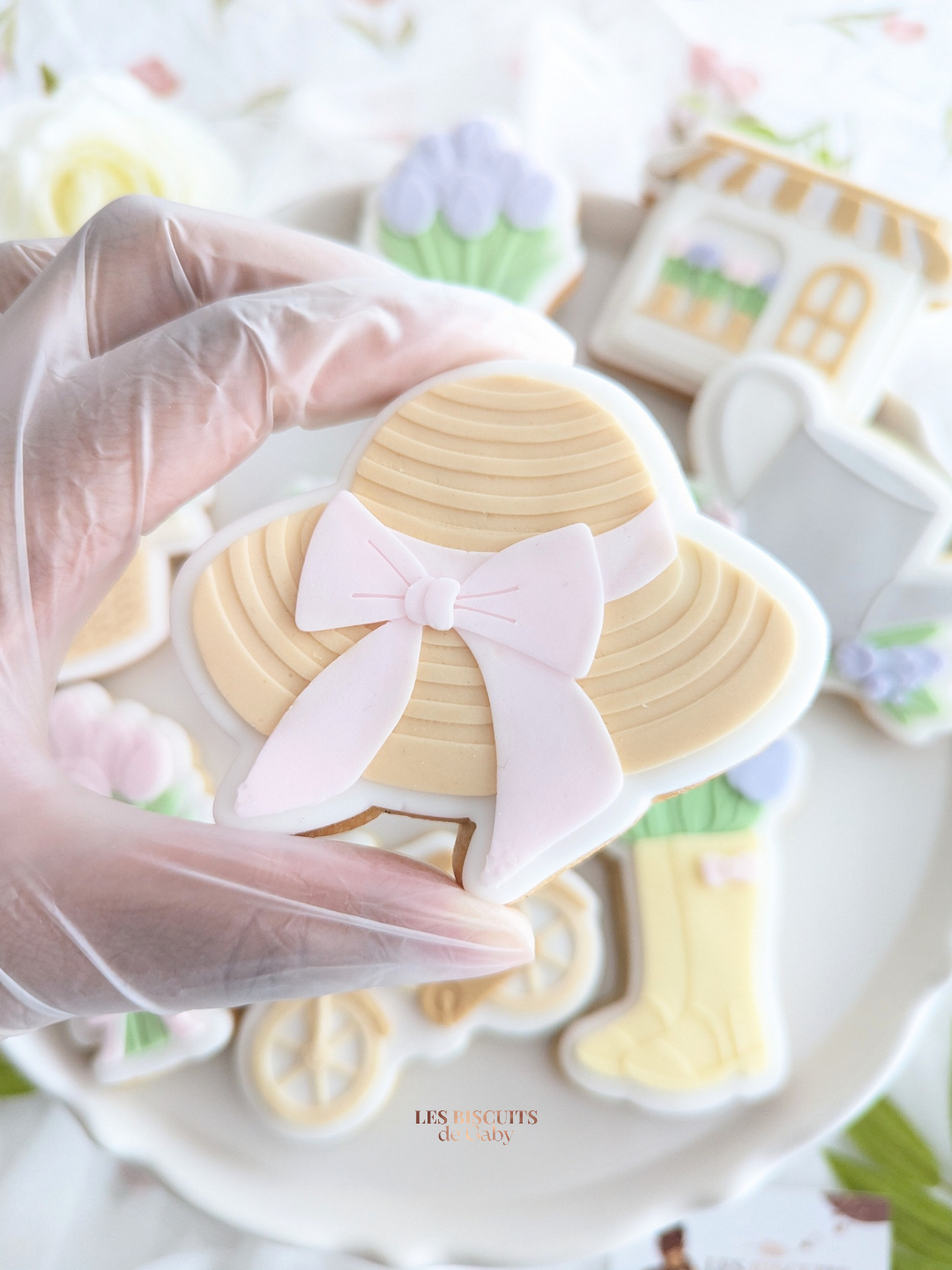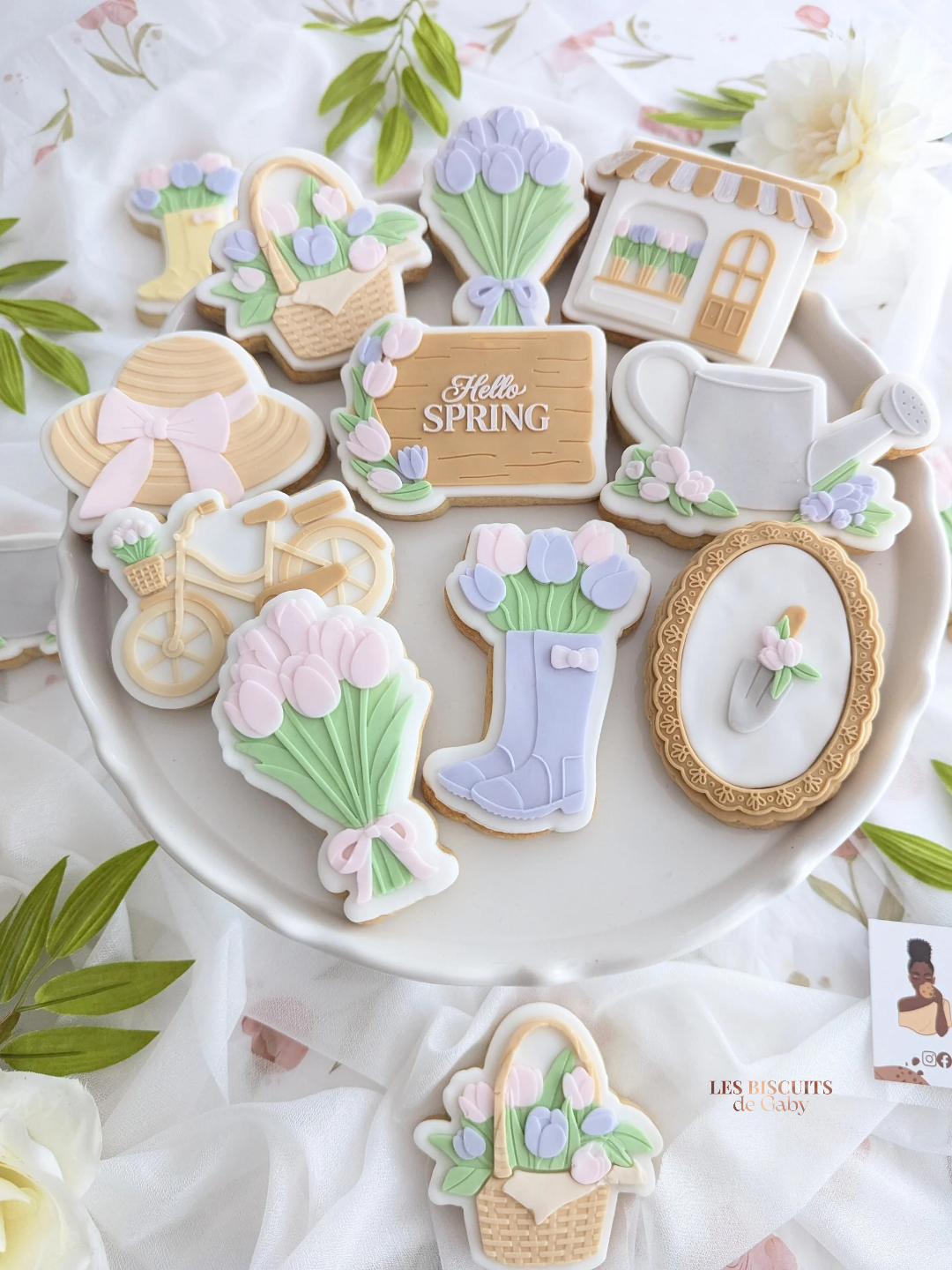 - Enseigne “Hello Spring” : un biscuit effet bois et fleurs printanières.