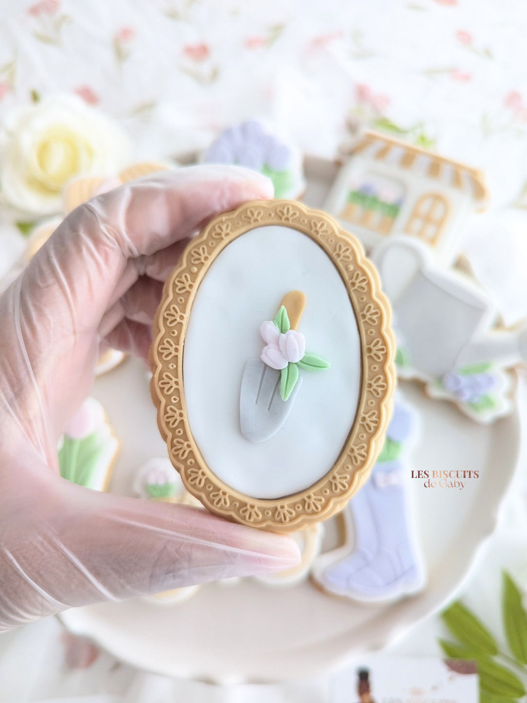 - Médaillon d’antan : une pelle de jardinage et sa fleur délicate. 🌸