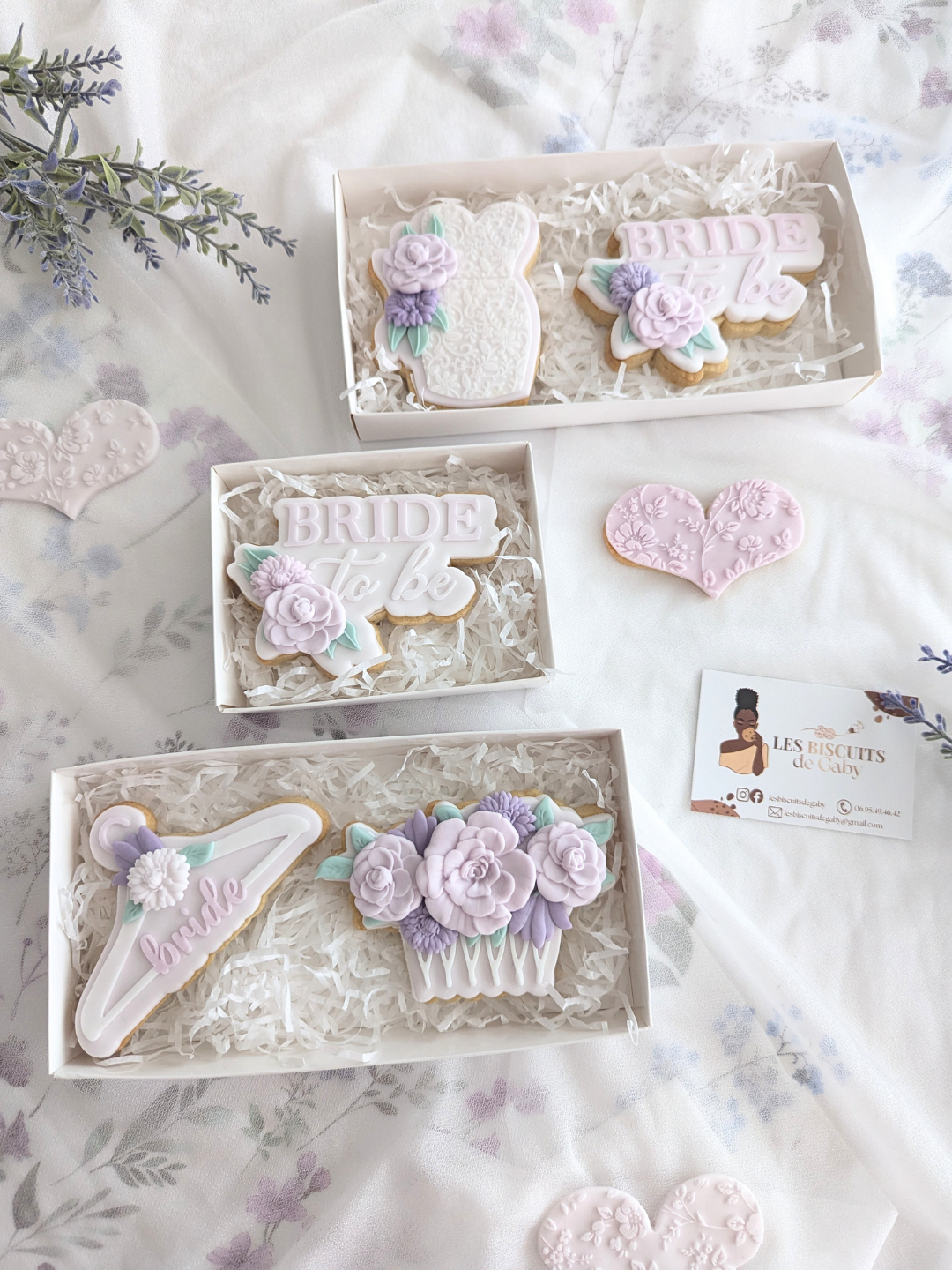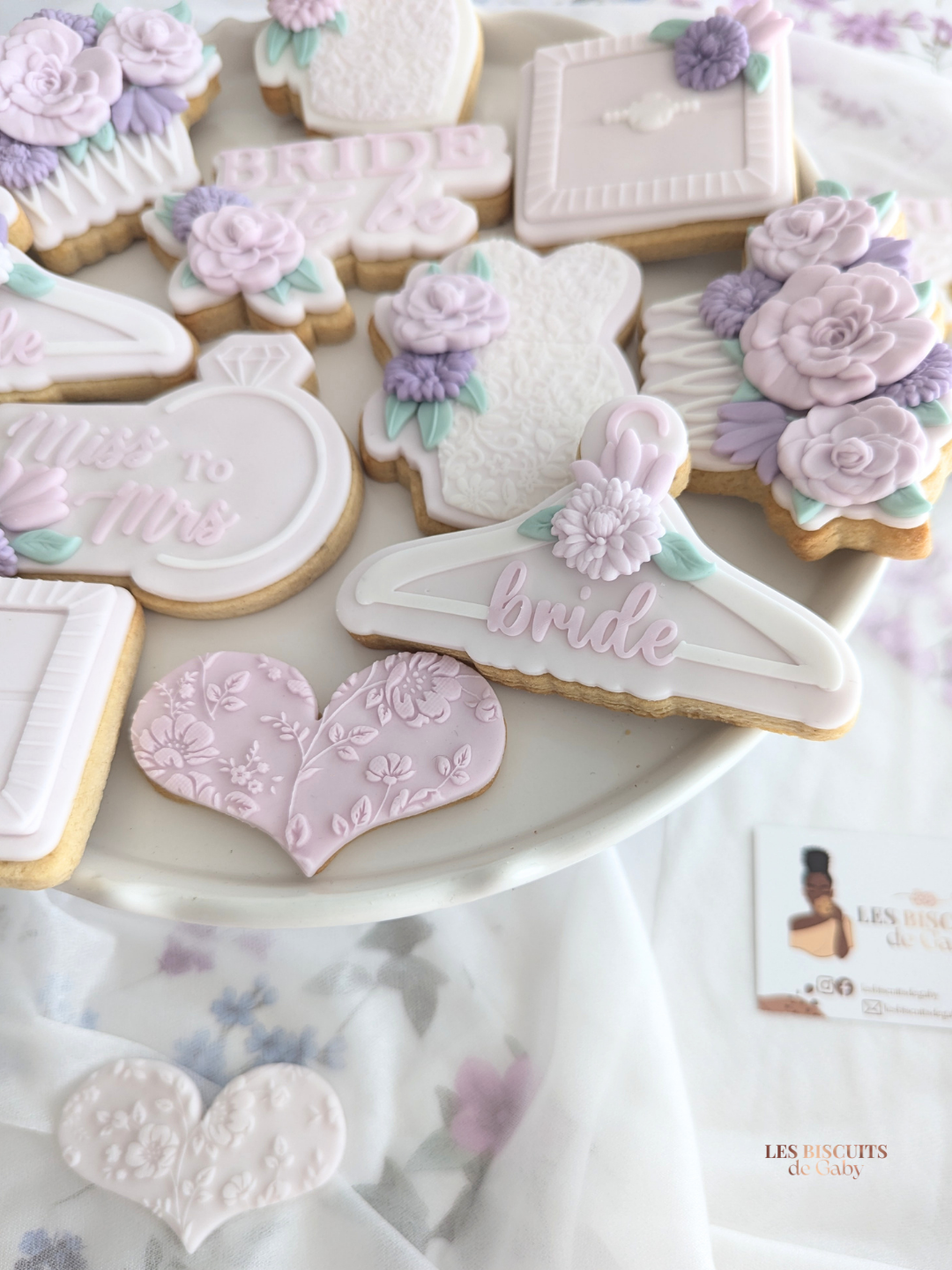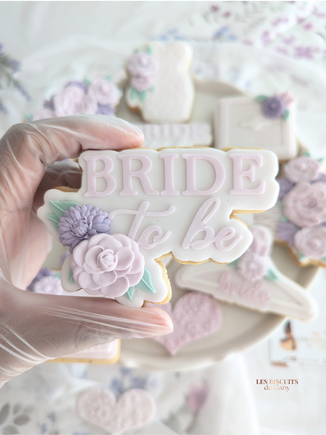 Plaques “Bride to be” : Des lettrages soignés entourés d’éclats de sucre et de fleurs en relief.