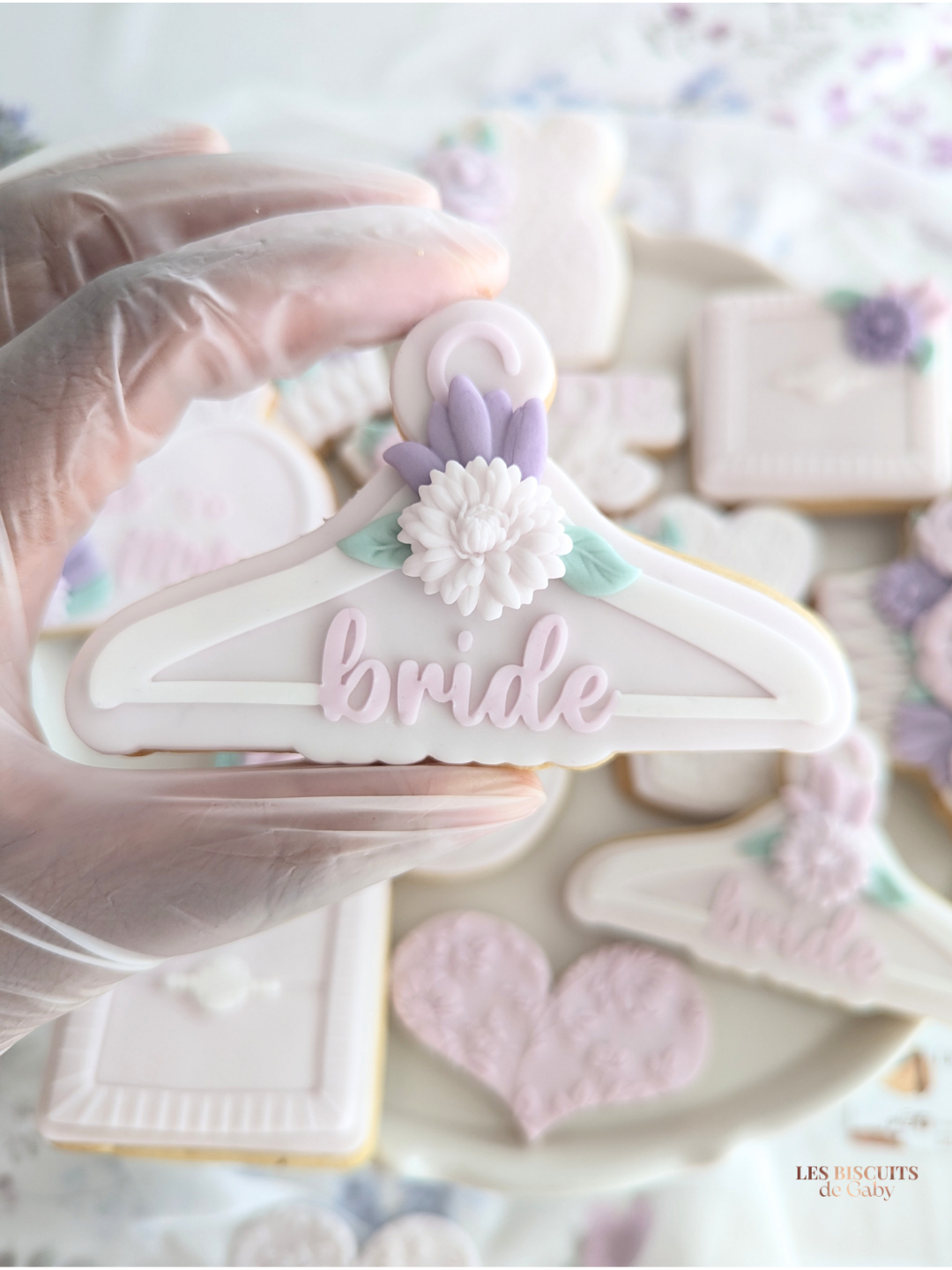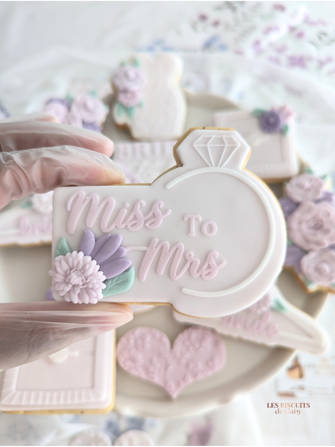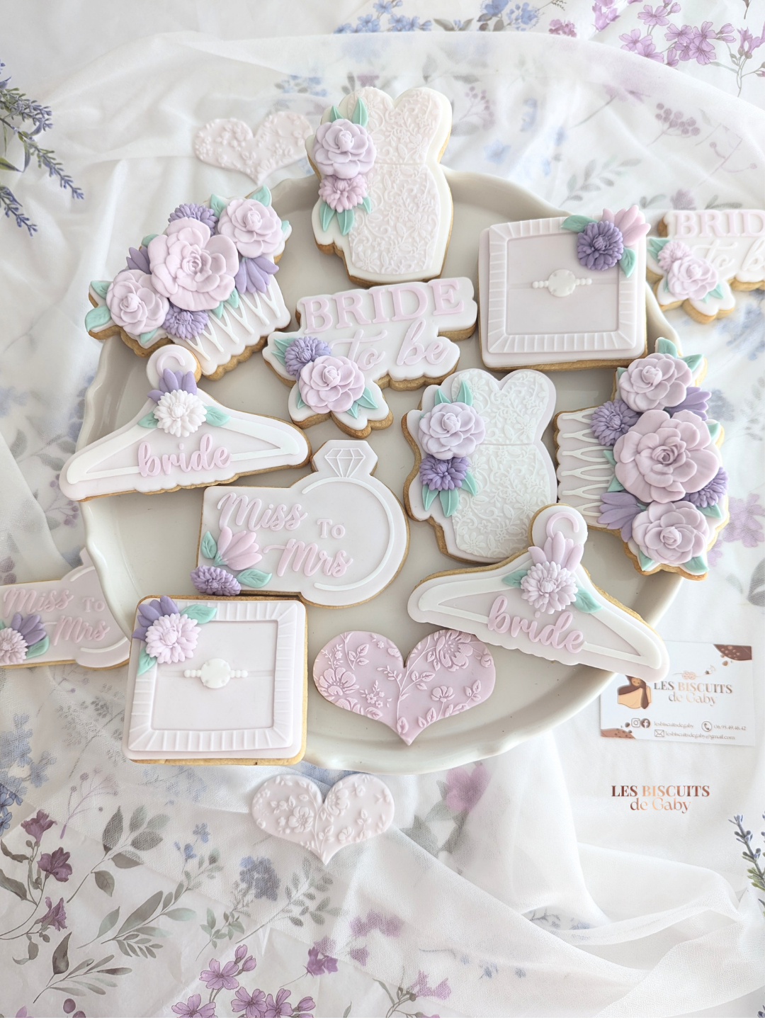 Plaques “Bride to be” : Des lettrages soignés entourés d’éclats de sucre et de fleurs en relief.