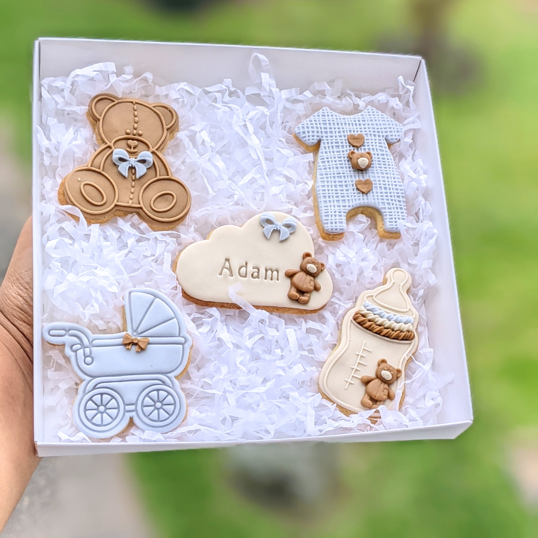 - 5 Biscuits Sablés Décorés : Des formes adorables sur le thème Ourson (un petit ourson , un body, une poussette , un biberon , et un nuage personnalisable.